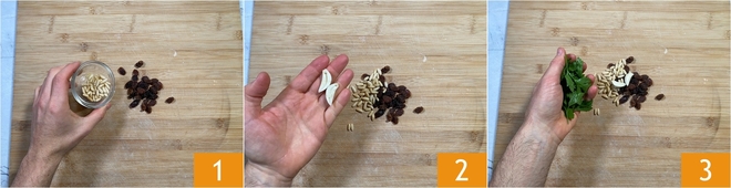 Pour préparer le ragoût napolitain, commencez par préparer les bracioles. Sur la planche, disposez les raisins secs (sans les tremper), les pignons 1, l'ail pelé et sans le germe 2 et les feuilles de persil 3. <\/p>
