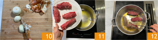 Pelez et hachez finement les oignons 10. Passez à la cuisine. Dans une casserole large, de préférence à fond épais, chauffez un filet d'huile puis ajoutez les bracioles 11, laissez-les sceller à feu vif. Retournez-les délicatement avec des pinces 12, bien dorer de tous les côtés puis mettez-les de côté.<\/p>