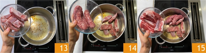 Poursuivez avec les autres morceaux de viande, ajoutez d'abord les travers de porc 13. Ensuite, ajoutez les saucisses 14 et le bœuf 15.<\/p>