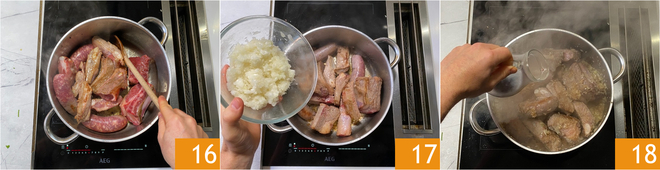 Faites bien dorer tous les morceaux de viande 16. À ce stade, ajoutez l'oignon 17 et augmentez légèrement le feu. Faites mijoter pendant quelques minutes et enfin déglacez avec le vin rouge 18 pour déglacer le fond.<\/p>