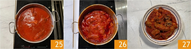 Laissez mijoter doucement 25 à feu doux pendant 4 heures. De temps en temps, n'oubliez pas de remuer, afin que l'oignon et la sauce ne collent pas au fond 26. Ajustez le sel et votre ragoût est prêt à être utilisé 27.<\/p>