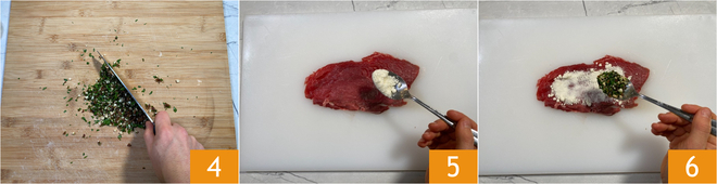 Hachez le tout assez finement 4. Étendez une tranche de tranche grasse sur une planche à découper, si elle est trop épaisse, aplatissez-la un peu entre deux feuilles de papier sulfurisé. Ajoutez un peu de pecorino romano râpé 5 et le mélange fraîchement préparé 6; veillez à laisser un bord libre et à ne pas recouvrir toute la tranche de viande.<\/p>