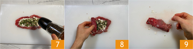 Ajoutez une pincée de poivre noir 7. Enroulez sur le côté le plus court de cette manière : repliez les extrémités vers l'intérieur, puis roulez la viande 8 et fixez les roulades avec des cure-dents, deux aux extrémités 9 et un au centre 9.<\/p>