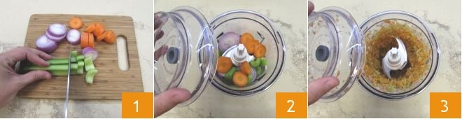 Pour préparer le ragoût de seitan, commencez par le soffritto d'arômes, à préparer de manière classique. Épluchez l'oignon, la carotte et le céleri et coupez-les en gros morceaux 1. Placez le tout dans le mixeur 2 et actionnez les lames jusqu'à obtenir un hachis très fin 3.