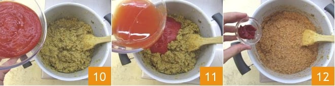 ajoutez la purée de tomates 10, en rinçant le bol avec un peu d'eau afin de récupérer toute la purée et rendre le ragoût un peu plus humide 11. Mélangez bien et ajoutez également le concentré de tomate 12.