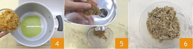 Chauffez l'huile dans une grande casserole et ajoutez le hachis d'arômes 4. Laissez rissoler à feu doux pendant au moins 15 minutes, jusqu'à ce que le soffritto soit sec. Pendant ce temps, occupez-vous du seitan. Insérez-le petit à petit dans un hachoir à viande 5 pour obtenir une viande hachée 6. Si vous n'avez pas de hachoir à viande, vous pouvez hacher le seitan au couteau.