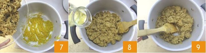 Ajoutez le seitan haché au soffritto 7 et laissez-le rissoler quelques minutes, en remuant souvent avec une cuillère en bois. Déglacez ensuite avec le vin blanc 8, et laissez-le s'évaporer. Dès que le ragoût redevient sec 9