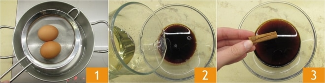Pour réaliser le ramen, commencez par les œufs marinés : faites cuire les œufs entiers dans de l'eau bouillante pendant 7 minutes 1. Pendant ce temps, préparez la marinade en versant dans un bol la sauce soja, le saké et le mirin 2, puis ajoutez la branche de cannelle 3.