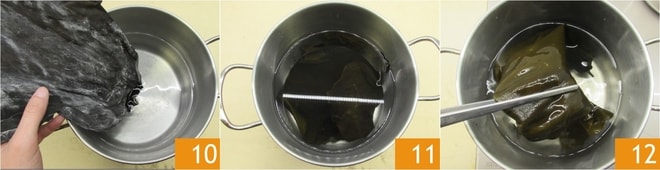 Entre-temps, faites tremper l'algue kombu dans une casserole avec 3 litres d'eau 10 et laissez-la à température ambiante pendant 12 heures 11. Une fois ce temps écoulé, retirez l'algue avec une pince 12 et utilisez l'eau pour le bouillon.