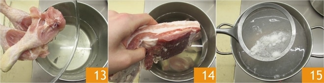 Ajoutez les carcasses de poulet 13 et le ventre de porc 14, couvrez avec le couvercle et commencez à cuire à feu vif pendant environ 15-20 minutes. À ce stade, écumez la mousse en surface 15, puis baissez le feu et faites cuire sans couvercle pendant environ une heure et demie.