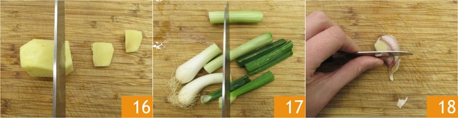 Entre-temps, préparez les ingrédients qui vous serviront à la fois pour le bouillon et pour la viande de porc : pelez et coupez le gingembre en morceaux 16, puis coupez grossièrement la partie verte de l'oignon nouveau 17. Enfin, épluchez les gousses d'ail 18.