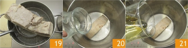 Après une heure et demie, vérifiez que la viande de porc est cuite en la piquant avec une fourchette, s'il n'en sort pas de sang, vous pouvez la retirer du bouillon qui doit continuer à cuire pendant encore 3-4 heures 19. Transférez le porc dans une autre casserole et ajoutez le saké 20 et le mirin 21.