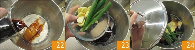 Versez également le tamari 22, puis ajoutez le gingembre, l'oignon nouveau et l'ail 23. Couvrez avec le couvercle et laissez cuire à feu doux pendant 2 heures 24.