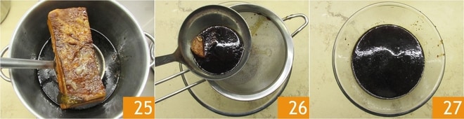 Une fois ce temps écoulé, retirez le ventre de porc 25 et gardez-le au chaud, puis filtrez le liquide de cuisson 26 et conservez-le également 27.