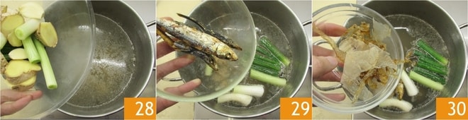 Une heure avant la fin de la cuisson du bouillon, ajoutez le gingembre, l'oignon nouveau et l'ail 28. Ajoutez également les niboshi 29 et continuez à cuire le bouillon. Une fois le temps de cuisson terminé, éteignez le feu et ajoutez une poignée de katsuobushi 30.