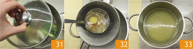 Couvrez avec le couvercle 31 et laissez infuser pendant 15 minutes. Ensuite, filtrez le bouillon avec une passoire fine 32 et gardez-le au chaud 33.