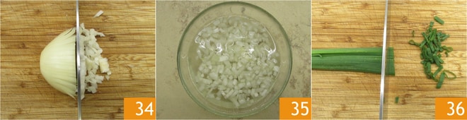 Enfin, préparez les ingrédients pour composer le plat : coupez un oignon en brunoise 34, plongez-le brièvement dans l'eau froide 35 et égouttez-le bien, puis coupez finement la partie verte de l'oignon nouveau 36.