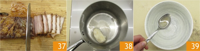 Coupez la viande de porc en tranches 37. Entre-temps, faites fondre le lard dans une petite casserole 38 et portez à ébullition une casserole d'eau non salée pour cuire les nouilles. Commencez à composer les bols en versant une cuillère de saindoux dans chacun 39.