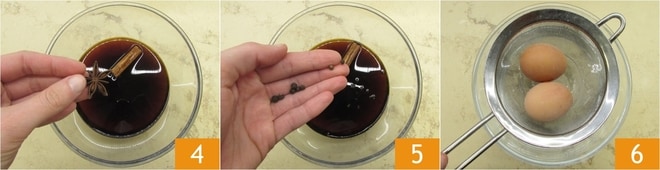 Ajoutez également l'anis étoilé 4 et les grains de poivre 5. Une fois le temps de cuisson écoulé, égouttez les œufs et transférez-les dans un bol d'eau froide 6.