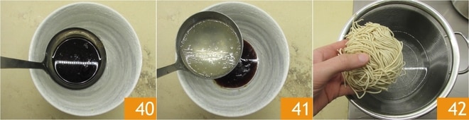 Ajoutez également 2 louches du liquide de cuisson du porc 40 et une louche de bouillon 41. Plongez les nouilles dans l'eau bouillante 42 et faites-les cuire pendant 30 secondes.