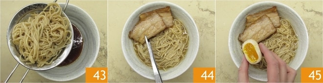 Égouttez bien les nouilles et versez-les dans les bols, en les disposant avec les pinces 43. Disposez 2 tranches de porc 44 et l'œuf mariné coupé en deux dans le sens de la longueur 45.