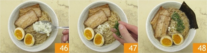 Complétez avec un peu d'oignon 46 et d'oignon nouveau hachés 47, un morceau d'algue nori et un tour de moulin à poivre. Votre ramen est prêt à être servi 48 !