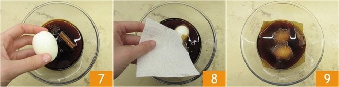 Écalez les œufs et plongez-les dans la marinade 7, puis couvrez avec une feuille de papier absorbant (non imprimé) 8 et laissez mariner pendant au moins 12 heures au réfrigérateur.