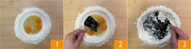 Pour préparer les raviolis à l'encre de seiche, commencez par la pâte fraîche aux œufs : versez la farine sur le plan de travail, formez un puits au centre et ajoutez-y les œufs 1. Ajoutez l'encre de seiche et mélangez avec une fourchette 2 pour incorporer toute la farine 3.