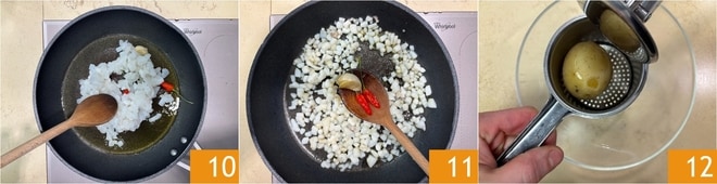 Ajoutez la seiche hachée 10 et faites cuire pendant 20 minutes à feu moyen avec un couvercle. Une fois la cuisson terminée, retirez l'ail et le piment 11. Quand les pommes de terre sont cuites, écrasez-les en purée avec un presse-purée 12.
