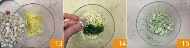 Ajoutez les seiches cuites dans le même bol où vous avez mis la purée de pommes de terre 13, puis assaisonnez avec du persil haché, une pincée de sel et de poivre 14. Mélangez pour amalgamer et laissez reposer au réfrigérateur pendant 10 minutes 15.