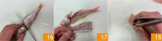 Nettoyez les rougets : détachez la tête 16, prélevez les filets 7 et retirez les arêtes 18.