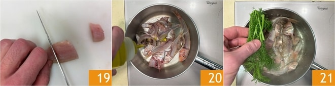 Coupez en losanges les filets nettoyés 19 et salez-les. Placez les restes des rougets dans une casserole, ajoutez un filet d'huile et faites griller pendant environ 4 minutes 20. Parfumez avec la marjolaine et le fenouil sauvage 21.