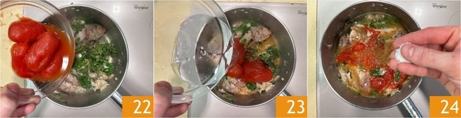 Ajoutez les tomates pelées 22, un verre d'eau 23, salez 24 et poivrez. Faites cuire pendant 20 minutes en remuant de temps en temps.