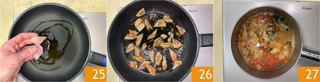 Entre-temps, chauffez un filet d'huile dans une poêle et déposez-y les rougets côté peau en bas 25. Quand la peau est bien dorée, retournez-les et terminez la cuisson 26. À ce stade, le jus sera prêt 27.