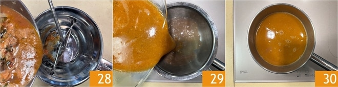 Passez le jus au moulin à légumes 28, puis filtrez le mélange à travers une passoire 29 et versez la sauce obtenue dans une petite casserole. Laissez réduire le jus pendant environ 20 minutes.