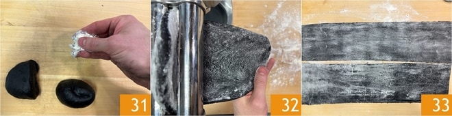 Reprenez la pâte, divisez-la en portions plus petites et travaillez-en une à la fois, en laissant les autres couvertes avec du film plastique pour éviter qu'elles ne sèchent. Saupoudrez la première portion de pâte avec de la farine 31, puis passez-la dans le laminoir pour l'affiner 32, en partant de l'épaisseur la plus grande jusqu'à obtenir des feuilles d'environ 2 mm d'épaisseur 33.