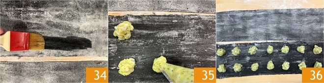 Humidifiez une feuille en la badigeonnant d'eau 34, puis déposez des petits tas de farce bien espacés les uns des autres ; vous pouvez utiliser une poche à douille ou vous aider de 2 cuillères 35 36.