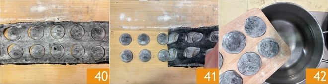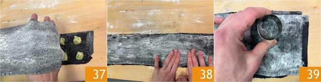 Couvrez avec une autre feuille 37, en la faisant bien adhérer autour de la farce 38; si vous avez un emporte-pièce plus petit, vous pouvez l'utiliser pour définir la forme et chasser l'air de la farce. Découpez les raviolis en coupant des disques avec un emporte-pièce de 5 cm de diamètre 39.