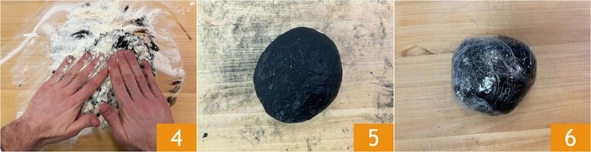 Poursuivez en pétrissant à la main 4 jusqu'à obtenir une pâte lisse et homogène 5. Couvrez avec un film plastique 6 et placez au réfrigérateur pendant 30 minutes.