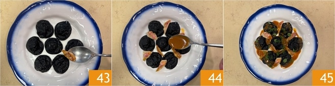 Une fois égouttés, disposez les raviolis dans les assiettes en ajoutant les filets de rougets dorés 43, le jus de poisson 44, les feuilles de marjolaine et le fenouil. Les raviolis à l'encre de seiche sont prêts à être servis 45 !