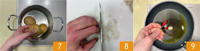 Occupez-vous de la farce : faites cuire les pommes de terre dans de l'eau bouillante pendant environ 30 minutes, ou jusqu'à ce qu'elles soient tendres. Découpez la seiche nettoyée en petits dés 8. Dans une poêle, chauffez un filet d'huile avec l'ail et le piment 9.