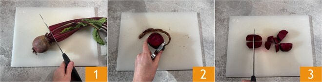 Pour préparer les raviolis à la betterave, commencez par la farce: séparez la racine de la betterave des feuilles 1, que vous utiliserez plus tard pour l'assaisonnement. Pelez la betterave 2 et coupez-la en dés d'environ 1,5 cm 3; vous devez obtenir environ 200 g de pulpe nettoyée.