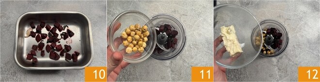 Quand la betterave sera bien rôtie, retirez l'ail 10 et transférez-la dans un mixeur, puis ajoutez les noisettes 11 et le gorgonzola 12 et mixez soigneusement.