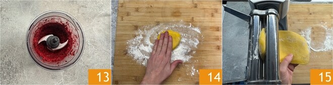 Vous devez obtenir une purée homogène 13, donc transférez-la dans une poche à douille sans embout et réservez au réfrigérateur. À ce stade, reprenez la pâte et prenez une portion à la fois, en veillant à garder le reste bien couvert pour éviter qu'elle ne sèche. Farinez et aplatissez légèrement la pâte 14, puis passez-la dans le laminoir à partir de l'épaisseur la plus large 15.