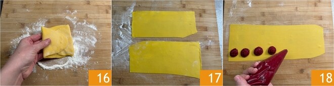 Repliez la feuille pour régulariser la forme 16, puis repassez-la à la première épaisseur et continuez en la diminuant progressivement jusqu'à atteindre l'avant-dernière. Vous devez obtenir des feuilles d'une épaisseur d'environ 2 mm 17. Pressez des petits tas de farce sur la moitié inférieure d'une feuille, en les espaçant bien entre eux 18.