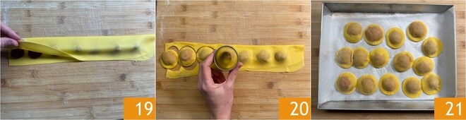 Repliez la moitié supérieure pour recouvrir les petits tas 19 et appuyez bien la feuille autour de la farce pour la faire adhérer parfaitement et faire sortir les bulles d'air. Découpez des raviolis ronds avec un emporte-pièce de 6,5 cm de diamètre 20 et continuez jusqu'à épuisement des ingrédients. Vous pouvez réutiliser les chutes de pâte en les pétrissant à nouveau après avoir laissé reposer brièvement la pâte. Au fur et à mesure que vous formez les raviolis, déposez-les sur un plateau recouvert de papier sulfurisé 21.
