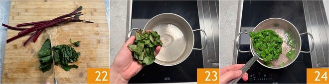 Occupez-vous de l'assaisonnement: reprenez les feuilles de betterave mises de côté et séparez les tiges. Coupez grossièrement les feuilles 22, en veillant à en garder quelques-unes entières pour le dressage. Blanchissez les feuilles coupées dans de l'eau bouillante salée pendant une minute 23. Égouttez 24 et conservez l'eau de cuisson qui vous servira à cuire les raviolis.