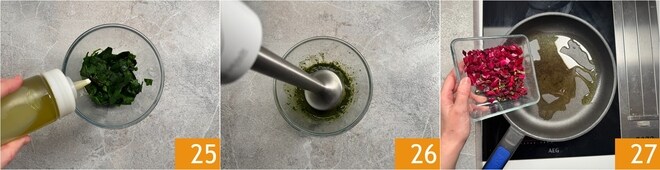 Transférez les feuilles dans un bol, ajoutez un filet d'huile d'olive extra vierge 25 et mixez avec le mixeur plongeant pour obtenir une purée 26. Dans une poêle à part, chauffez un filet d'huile et ajoutez les tiges de betterave coupées en morceaux 27.