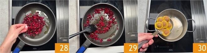 Salez 28 et faites sauter à feu vif pendant 3-4 minutes 29. Plongez les raviolis dans la même eau où vous avez cuit les feuilles 30, après l'avoir ramenée à ébullition.