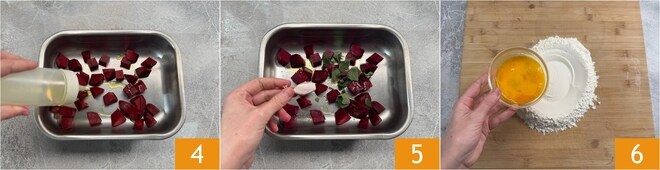 Transférez la betterave dans un plat et assaisonnez avec de l'huile 4, de la sauge abondante hachée à la main, du sel 5 et une gousse d'ail. Faites cuire au four statique préchauffé à 200° pendant environ 35 minutes. Pendant ce temps, occupez-vous de la pâte fraîche: sur le plan de travail, versez la farine, formez un puits au centre et versez les œufs ici 6.